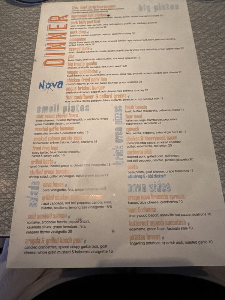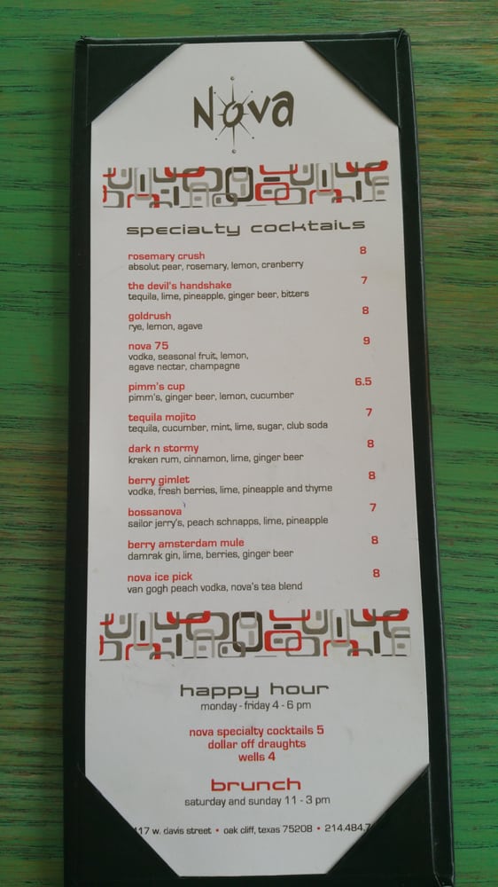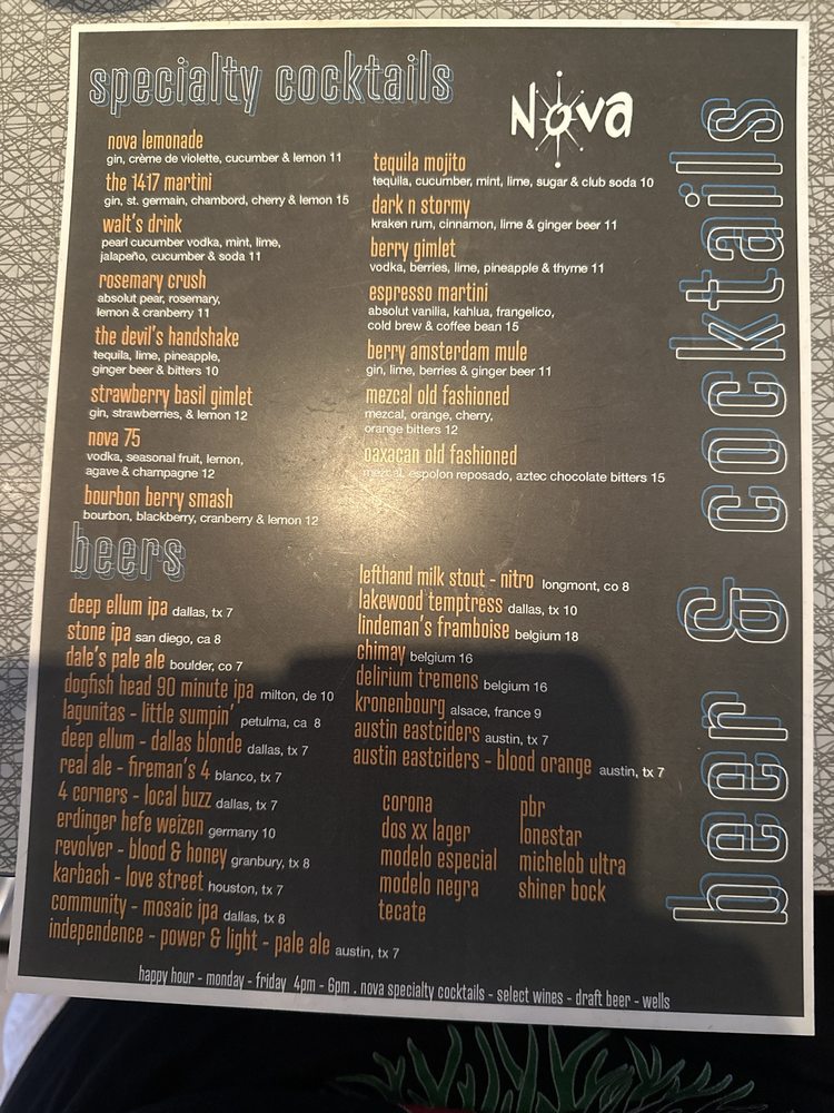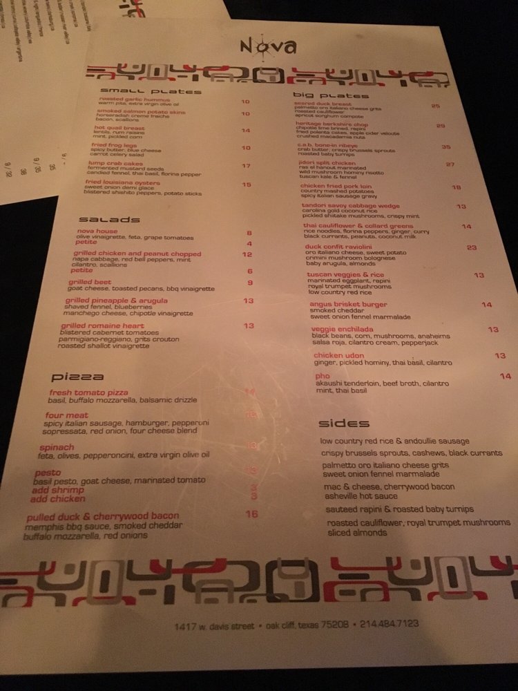 Nova is a trendy gastropub located in Dallas, TX, offering a diverse menu with a focus on New American cuisine. The restaurant provides a range of amenities, including delivery, takeout, reservations, and vegan options. With a casual and hipster atmosphere, Nova is wheelchair accessible and features outdoor seating for guests to enjoy. The menu boasts a variety of salads, small plates, and big plates, each crafted with innovative flavors and ingredients. Standout dishes include the Grilled Chicken and Peanut Chopped Salad, Fried Frog Legs, and the Pork Belly Pad Thai. The creative combinations and attention to detail make Nova a must-visit for food enthusiasts looking for a unique dining experience. The restaurant also offers happy hour specials, full bar service, and accommodating options for groups and families.